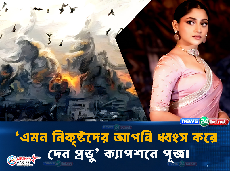 ফেসবুকে দুটি আর্টওয়ার্ক এবং একটি ছবি দিয়ে তিনি তুলে ধরেছেন অসহায় ফিলিস্তিনিদের বর্তমান পরিস্থিতি। এরপর বিবেকের কাছে প্রশ্ন ছুড়ে দিয়ে ক্যাপশনে পূজা লিখেছেন, ‘এই ধ্বংসলীলার শেষ কবে প্রভু, যাদের হাত থেকে মাসুম বাচ্চাদেরও রেহাই নেই, এমন নিকৃষ্টদের আপনি ধ্বংস করে দেন প্রভু।’