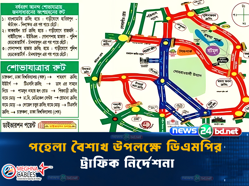 এতে বলা হয়, ডাইভারশন/ব্যারিকেড পয়েন্টসমূহ: সোমবার (১৪ এপ্রিল) ভোর ৫টা হতে রমনা পার্ক (রমনা বটমূল), সোহরাওয়ার্দী উদ্যান, ঢাকা বিশ্ববিদ্যালয় এলাকা ও আশপাশের নিম্নলিখিত এলাকাসমূহে সড়কে যানচলাচল নিয়ন্ত্রণ করার লক্ষ্যে রাস্তা বন্ধ/রোড ডাইভারশন দেওয়া হবে: