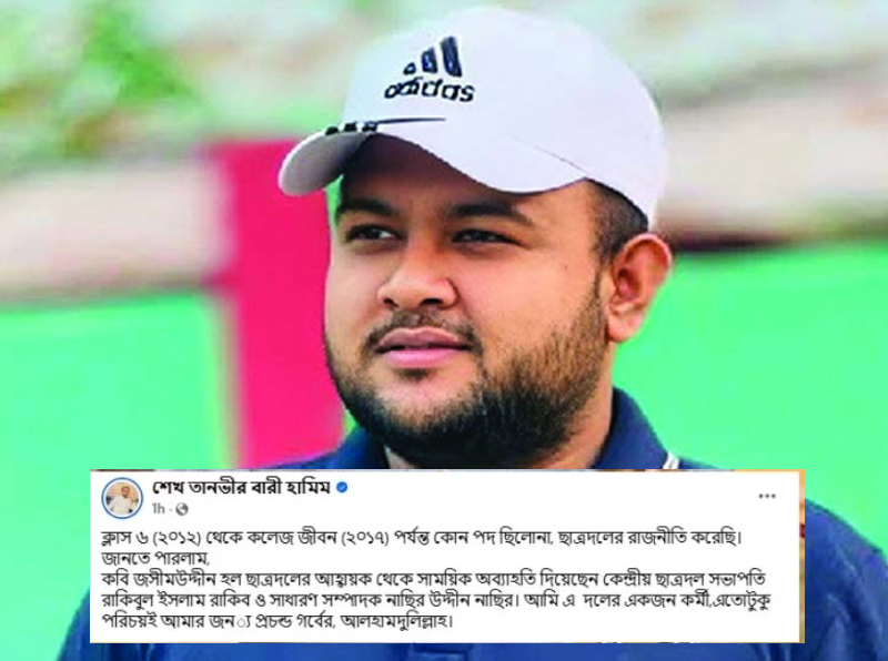 দলীয় শৃঙ্খলা ভঙ্গের অভিযোগে পদ হারানোর পর সামাজিক যোগাযোগমাধ্যমে নিজের প্রতিক্রিয়া জানিয়েছেন ঢাকা বিশ্ববিদ্যালয়ের কবি জসীম উদ্দীন হল ছাত্রদলের আহ্বায়ক ও ঢাকসু নির্বাচনে ছাত্রদলের জিএস প্রার্থী শেখ তানভীর বারী হামিম।