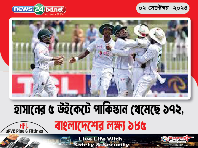 ২ উইকেটে ৯ রান দিন শুরু করা পাকিস্তান আজ বাকি আট উইকেটে যোগ করেছে ১৬৩ রান। অপরাজিত থাকা আগা সালমানের ৪৭ রানই সর্বোচ্চ, মোহাম্মদ রিজওয়ান করেছেন ৪৩। বাংলাদেশের পক্ষে ৪৩ রানে ৫ উইকেট নিয়েছেন হাসান, নাহিদ রানার শিকার ৪৪ রানে ৪ উইকেট। অন্য উইকেটটি তাসকিন আহমেদের।